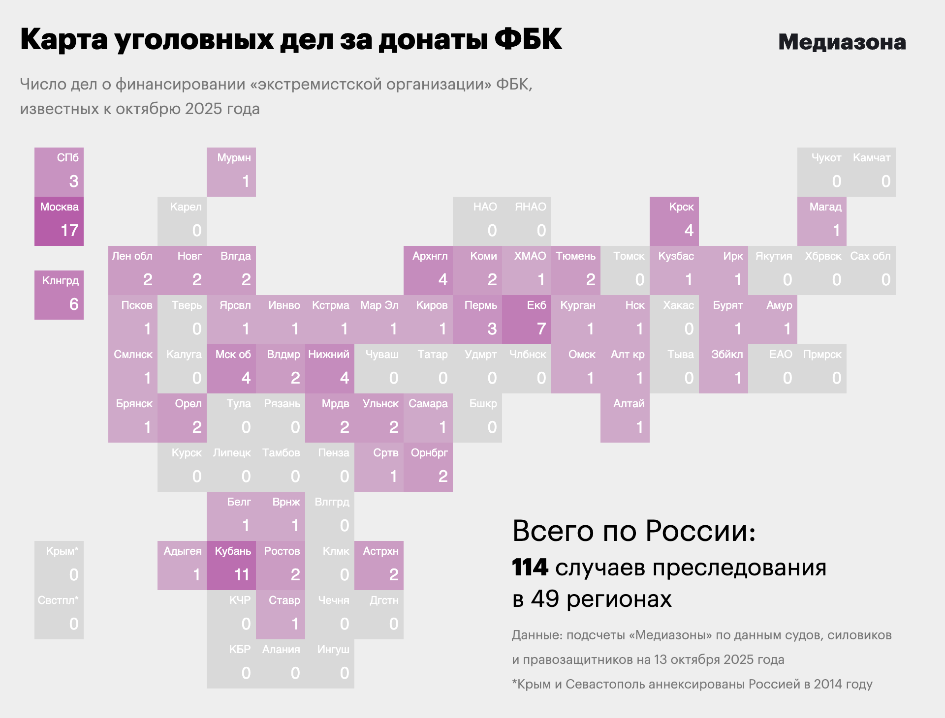 Дела о донатах ФБК мы зафиксировали в 49 регионах России от Калининградской до Магаданской области. Большинство дел возбуждено в Москве (17 случаев), следом идет Краснодарский край с 11 делами. В Свердловской области семь дел, а в Калининградской — шесть.