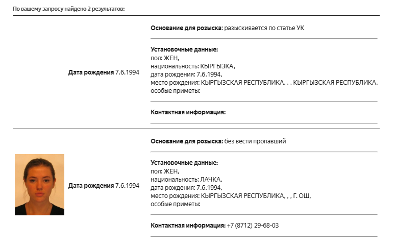 При этом Иминову объявили в розыск дважды — как пропавшую без вести и как разыскиваемую «по статье УК». Как выяснила «Медиазона», женщину как пропавшую без вести объявили в розыск не позднее 31 марта 2026 года. В первой карточке в поле национальность указано, что она кыргызка, во второй — что лачка. Национальность Байсарова, также разыскиваемого «по статье УК», в карточке указывать не стали.
